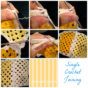 I didn't have the colours used in the book, but I liked the idea of solid squares with a plain border, along with a rainbow type colour scheme. I played around with the colours I did have, but couldn't really get it to work until I decided to stick to the yellows and grey. I went with a five by five block blanket which along with a wide border is a great size for a baby blanket or lap blanket. I joined the squares using single crochet in the back loops only. There's a quick tutorial on how I joined them below. This method works well when you want a solid background look, or you want to have your squares defined or outlined really well. It also is easy to do, uses minimal yarn and is super quick.